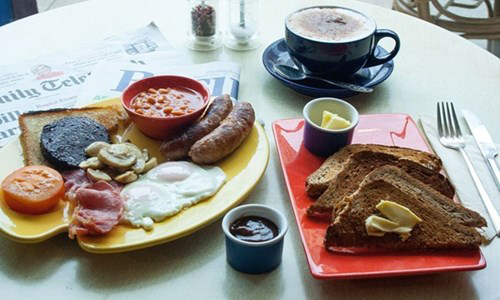 Nếu có một bữa ăn tiêu biểu nhất cho ẩm thực Anh chính là bữa sáng. Có nhiều cách khác nhau để chế biến, nhưng một bữa ăn sáng đúng chất Anh sẽ gồm thịt xông khói, trứng chiên hoặc luộc, nấm chiên và cà chua, bánh mỳ nướng phết bơ, xúc xích, bánh pudding đen và đậu nướng. Đó là phương thuốc hiệu nghiệm để chữa chứng jetlag (lệch múi giờ).