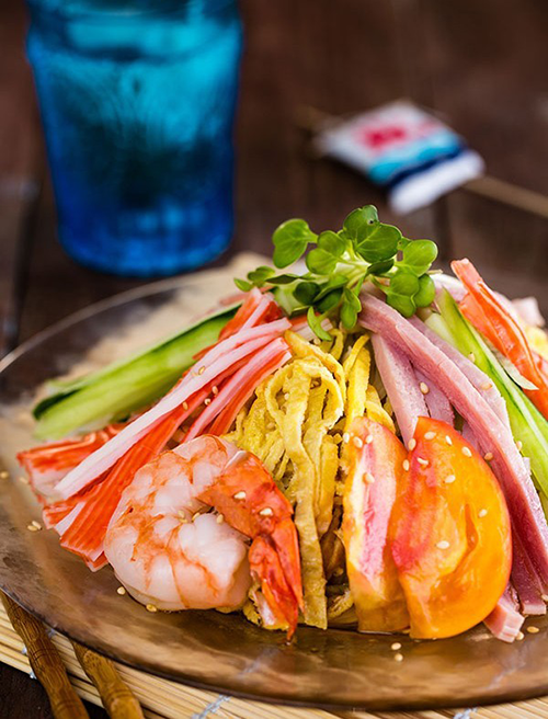 Món mì trộn siêu tốc này thực ra được biến tấu theo món mì lạnh kiểu Nhật nên có màu sắc và hương vị vô cùng tinh tế. Việc thêm chút rượu sake trong lúc luộc tôm sẽ giúp bạn loại bỏ mùi tanh của tôm và làm cho thịt tôm mềm hơn. Bạn có thể cho thêm ít trứng cá muối lên trên để dùng kèm tùy thích.