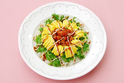 Nếu dùng cho bữa sáng, bạn cho cơm nóng ra đĩa, đặt lớp lá diếp xoắn lên trên, cho thịt hộp vào giữa và xếp trứng vòng tròn bên ngoài. Còn nếu mang tới văn phòng, bạn xếp tương tự nhưng thay vì cho vào đĩa thì bạn cho vào hộp, tới bữa trưa bạn làm nóng cơm trong lò vi sóng là có bữa trưa vừa ngon vừa đẹp lại đủ dinh dưỡng!