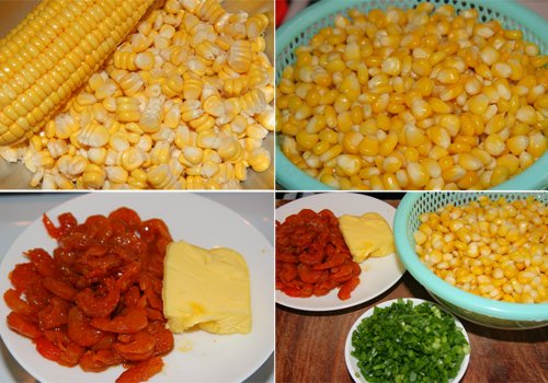 - Bắp tách lấy hạt, rồi hấp chín. Hành lá rửa sạch, thái nhỏ.