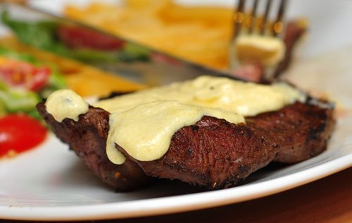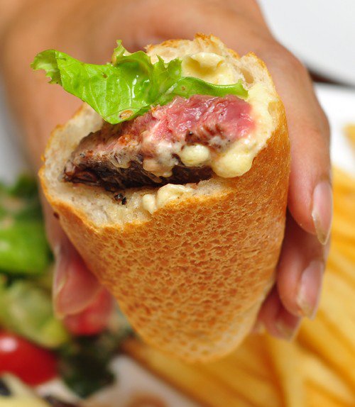 Bít tết ở đây được quảng cáo là sử dụng thăn vai bò Mỹ, miếng bít tết càng nhai càng ngọt. Nếu ăn "dỗ mồi", miếng bít tết như vậy chắc hẳn sẽ hết rất nhanh. Tuy nhiên, nhiều khách có cách thưởng thức thú vị - từ tốn bẻ đôi chiếc bánh mì, cắt thịt thành miếng nhỏ bỏ vào, cho thêm salad, quết nhanh ít pho mai, xong xuôi mới nhẩn nha thưởng thức. Hơi rườm rà song lại ngon miệng mà no lâu.