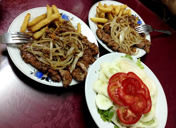 Chim quay thơm ngon nức tiếng là vậy, còn món bít tết của quán cũng được thực khách truyền tai nhau nhiều không kém. Không đa dạng như các hàng khác, đĩa bít tết ở đây chỉ gồm miếng thịt bò lớn bằng hai bàn tay được cắt miếng nhỏ sẵn, khoai tây chiên vàng và một ít hành tây cắt sợi rải lên trên.