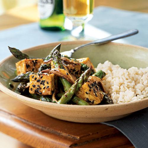 Đây là món ăn đơn giản với đậu phụ xào cùng mè đen và măng tây để ăn kèm với các món cơm