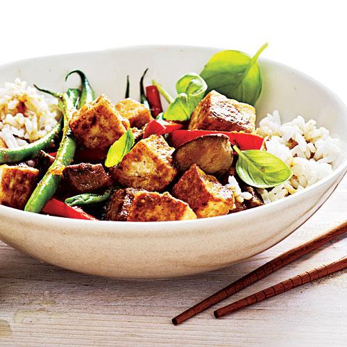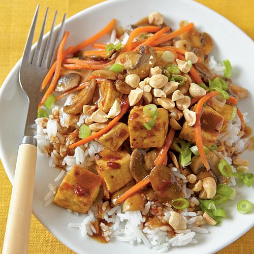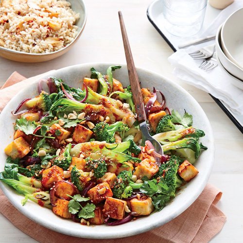 Đậu phụ chiên với nước sốt ớt ngọt và bông cải xanh
