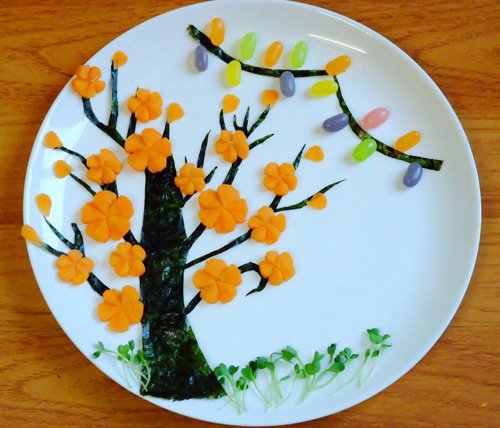 Bước 5: Đặt hoa vừa tỉa lên cành đào bằng rong biển bạn vừa tạo, xếp một ít rau mầm dưới gốc. Cắt hai đoạn rong biển cong mỏng để tạo hình dây điện, đặt kẹo màu so le.