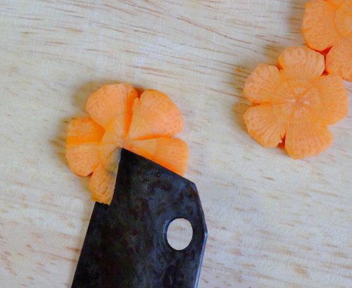 Bước 1: Với cách tỉa hoa đào 3D là sau khi khứa chữ V để tạo hình bông hoa xong, bạn cắt miếng cà rốt hình bông hoa thành từng lát dày 3-5 mm.