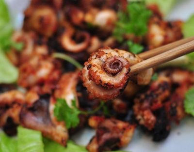 Bạch tuộc nướng sa tế hợp lý nhất là để khai vị. Không ăn theo kiểu lụi trực tiếp trên than hoa, bạch tuộc ở đây nướng sẵn nhưng khi bưng ra cho khách vẫn hấp dẫn không kém. Bạch tuộc đã tẩm ướp, nướng lên có màu vàng đỏ, lấm tấm hạt ớt; cuộn râu cong veo đôi chỗ cháy cạnh; mùi thơm của đồ nướng và sa tế quyện với nhau dù không cần tỏa khói nghi ngút cũng khá dậy mùi. Lúc ăn, thịt bạch tuộc giòn sần sật ngấm gia giảm, chấm thêm nước mắm đặc biệt của quán, món này có thể nói ngon từ hình ảnh đến hương vị.