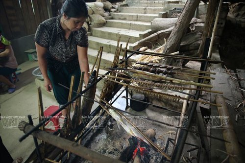 Cá sau khi được moi ruột, làm sạch sẽ được kẹp vào que tre tươi để nướng.