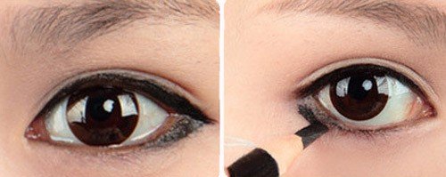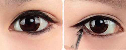 Bước 3: Dùng chì kẻ đường viền dưới mắt. Kè một đường nhạt theo hướng đuôi mắt ngược vào bên trong