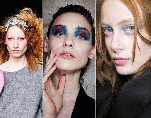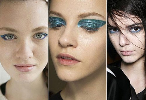 Cách make-up mắt bằng gam xanh gợi nhớ trào lưu làm đẹp của những năm 90. Nếu Temperley London kết hợp khéo léo giữa sự phá cách và nét đẹp hút hồn bằng việc thoa phấn màu khói và kẻ viền mắt dưới bằng chì xanh (phải) thì nhà mốt Christian Dior lại phủ toàn bộ bầu mắt theo dáng xếch lên sắc sảo với phấn xanh và nhũ ánh (giữa). Trong khi đó, Marchesa lăng xê xu hướng dùng chì xanh vẽ nửa viền mắt trên, dưới.