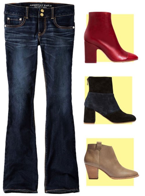 Mùa thu là mùa lên ngôi của những chất liệu cứng cáp như da hay da lộn. Kết hợp quần jeans ống loe cổ điển với đôi boot ngắn cổ từ những chất liệu này sẽ tăng thêm chất thời trang cho phong cách của bạn.