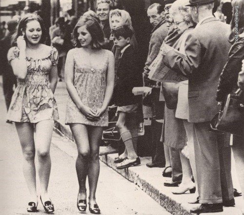 Hai cô gái dạo bước trên đường phố thị trấn Cape năm 1965. Váy búp bê liền có phần vai bèo nhún hay khoét cổ vừa vặn đều làm tăng nét nữ tính cho người mặc. Hãy chú ý đến đôi giày da bóng mà hai cô sử dụng: rất thời trang và nhã nhặn.(Nguồn: Đẹp/Vietnam+)
