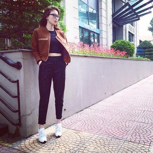 Đậm chất thể thao, năng động, là phong cách xuống phố ngày đông của hot girl đa tài Linh Rin. Cô kết hợp gam màu tuyền đen quần baggy ống lửng cùng crop top (áo lửng hở eo) cá tính. Điểm nhấn ấn tượng của set đồ chính là áo khoác dáng ngắn gam màu cà phê và sneaker trắng khỏe khoắn.