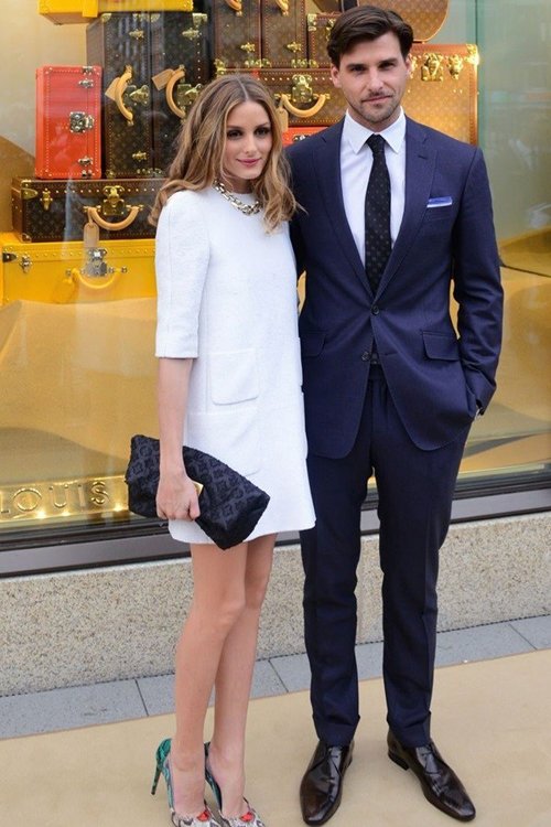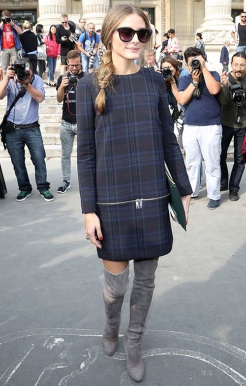 Olivia Palermo lại chuộng sự thanh lịch, sang trọng khi chọn váy suông kẻ ô màu xanh navy của Zara và bốt ghi cao cổ Stuart Weitzman.