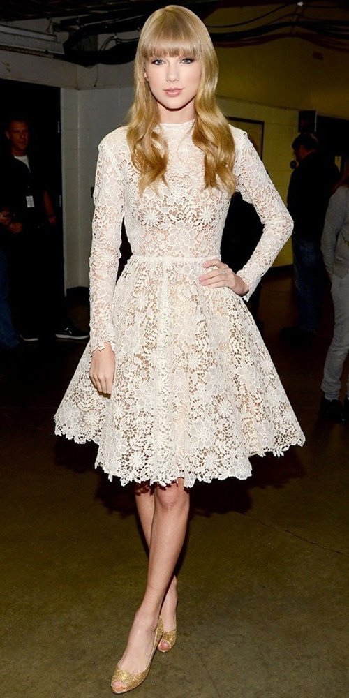 Bí quyết cho những cô nàng chuộng nét đẹp nhẹ nhàng, đáng yêu là những chiếc váy chữ A dáng hơi xòe, sắc màu dịu như màu kem, màu trắng hay hồng phấn. Taylor Swift thật nổi bật trong chiếc váy ren vòng eo thắt cao của Maria Lucia Hohan.