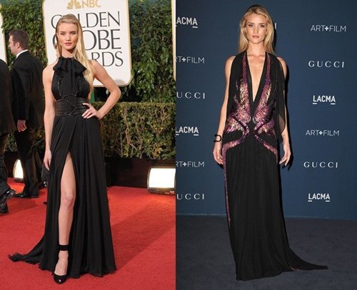 Đầm halter luôn là sự lựa chọn hàng đầu để tỏa sáng cùng các sao trên thảm đỏ. Rosie Hungtinton Whiteley luôn chọn kiểu váy để khoe dáng ngọc trong các sự kiện lớn (bên trái: Saint Lauren, bên phải: Gucci)
