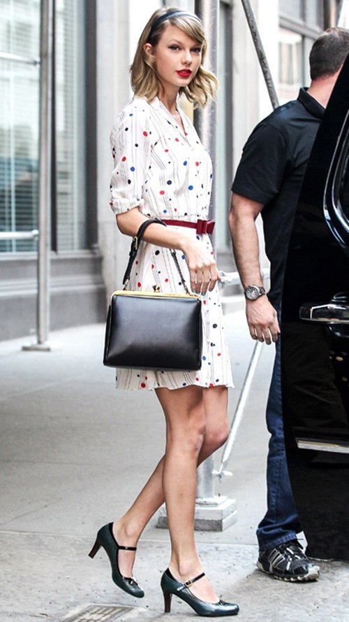 Chẳng cần đắn đo khi phải lựa chọn trang phục trong cả một tủ đồ, các cô nàng công sở chỉ cần một chiếc shirt dress với dây thắt eo khéo léo khoe dáng, tự tin dạo bước trên một đôi giày cao gót buộc dây ấn tượng. Đây cũng là trang phục dạo phố quen thuộc của Taylor Swift (váy Michael Kors, túi xách Dolce&Gabbana)