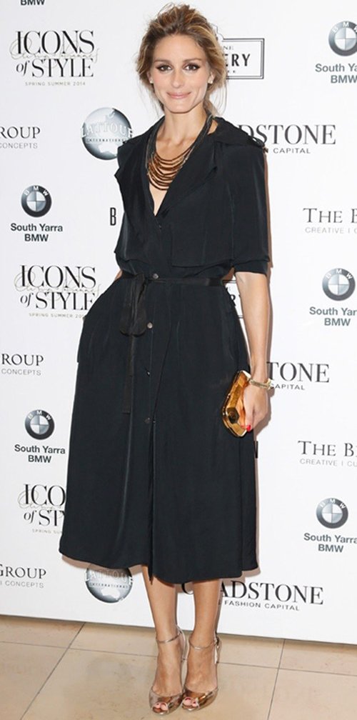 Olivia Palermo phối váy sơmi dáng dài cùng phụ kiện ánh kim rất nổi bật.