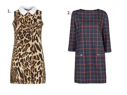 1. Váy suông họa tiết da báo của Dorothy Perkins giá 35USD, 2. Váy suông Mango giá 90USD.