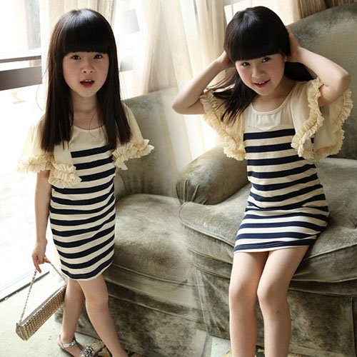 Vào những ngày trời nắng ấm, mẹ có thể cho bé diện váy cotton liền thân kẻ ngang, với điểm nhấn là phần tay bèo nhún cực điệu thế này. Chiếc váy sẽ phù hợp với một đôi xăng đan đính hạt lấp lánh và một chiếc túi xách cũng đính cườm. Ai cũng sẽ phải chú ý tới bé bởi vẻ thanh lịch, dịu dàng mà bộ trang phục này mang lại.