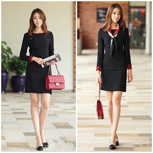 Váy tay dài màu đen, kết hợp với điểm nhấn ở cổ áo, chiếc váy sẽ hợp với những cô nàng hơi mập.