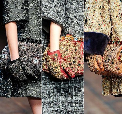 Những chiếc găng tay được trang hoàng lộng lẫy cũng là một điểm nhấn đáng chú ý của mùa mốt cuối năm. Xuất hiện trong show diễn Dolce & Gabbana, trào lưu những này được yêu thích nhờ sự sang trọng và quý phái toát ra từ những thiết kế chi tiết mạ vàng và nạm ngọc được đính tài tình trên găng tay mang đậm nét hình ảnh của phong cách baroque.