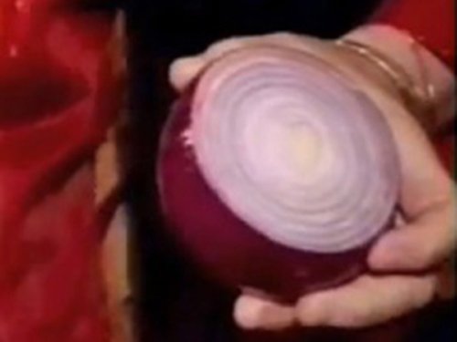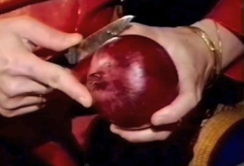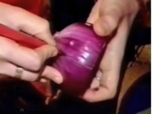 Đặt mũi dao trên mặt cắt của củ hành (cách lõi khoảng nửa cm) rồi kéo xuống.