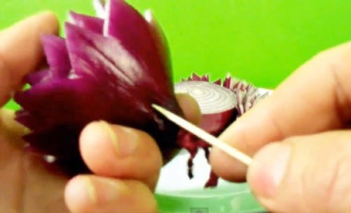 Bước 4: Khi đã tỉa xong tất cả các lớp hành, dùng một cây tăm đâm xuyên qua lõi để giữ các lớp liên kết với nhau.