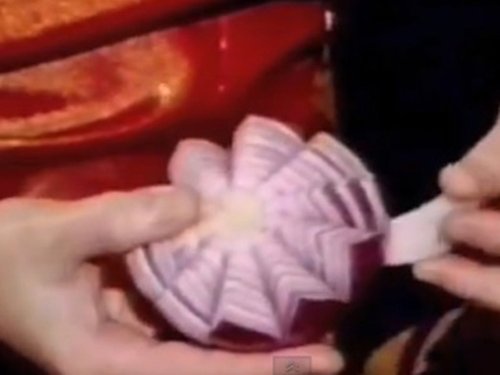 Bước 3: Dùng dao nhọn chuyên để tỉa rau củ bổ củ hành thành 8 phần theo kiểu múi cau. Chú ý không cắt đứt hẳn các múi.