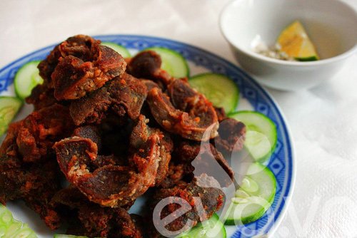 Trình bày mề gà chiên giòn ra đĩa, ăn kèm với muối tiêu chanh.