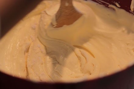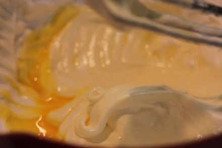 - Cho tiếp lòng đỏ trứng vào đánh cùng, đánh tiếp khoảng từ 2 đến 3 phút đến khi hỗn hợp lòng đỏ quyện với lòng trắng.
