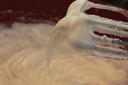 - Lòng trắng trứng đánh ra âu sạch, dùng máy đánh trứng đánh bông tầm 1 phút thì thêm đường, muối vào đánh cùng, tùy theo tốc độ của máy đánh từ 8 đến 10 phút đến khi hỗn hợp lòng trắng nhấc ngược que máy đánh trứng lên không chảy thành từng dòng là đạt.