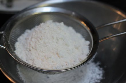 - Cho bột mỳ ra bát, dùng đồ rây, rây bột hai lần cho thật mịn.