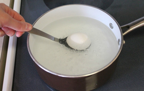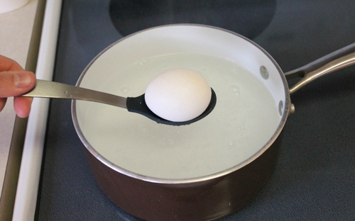 Bước 3: Nhẹ nhàng thả trứng xuống nồi, khi thìa chạm xuống đáy nồi, nhẹ nhàng nghiêng quả trứng để trứng lăn ra khỏi thìa. Làm thế này để tránh vỏ trứng bị dập.