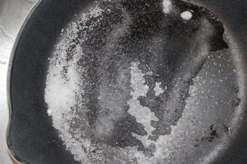 Khi nước trong chảo đã cạn khô, rắc muối hạt lên những chỗ bị cháy hoặc các vết dầu mỡ cáu bẩn lâu ngày và cọ nhiều lần. Bạn có thể sử dụng khăn giấy, bọt biển hoặc một miếng khoai tây tươi để cọ.