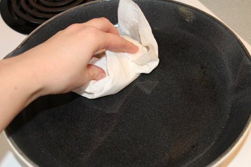 Cuối cùng, lau hoặc rửa sạch lớp dầu dừa trong chảo là được.