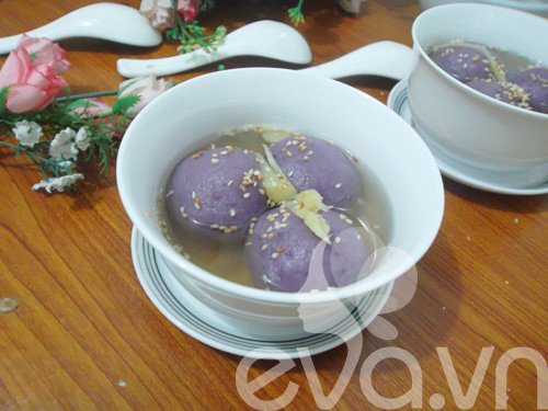 Tắt bếp cho chè trôi nước khoai lang tím ra bát, thêm ít vừng rang thơm lên trên và thưởng thức ngay tiết trời sang thu bạn nhé!