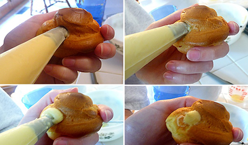 - Dùng dao rạch hoặc đâm một lỗ nhỏ trên phần vỏ bánh ( bước 1). Sau đó lấy bắt kem đã chuẩn bị ở bước 2, bơm kem vào bánh.