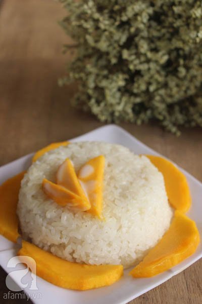 Rưới nước cốt dừa lên bề mặt xôi khi xôi còn nóng để đảm bảo phần cốt dừa sẽ thấm đều vào xôi sau đó xếp xoài lên trên.