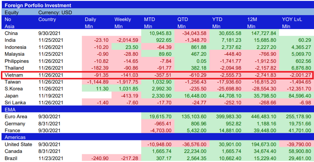 Bất chấp những diễn biến tích cực của thị trường chứng khoán Việt Nam, nhà đầu tư nước ngoài tỏ ra không mấy mặn mà khi liên tiếp bán ròng. Thống kê trong 11 tháng đầu năm, khối ngoại đã bán ròng kỷ lục gần 58.000 tỷ đồng trên toàn thị trường. Lực bán của khối ngoại diễn ra xuyên suốt trong phần lớn thời gian năm 2021, ngoại trừ hai tháng 7 và tháng 4 mua ròng nhẹ với sự xuất hiện của quỹ Fubon FTSE Vietnam ETF.