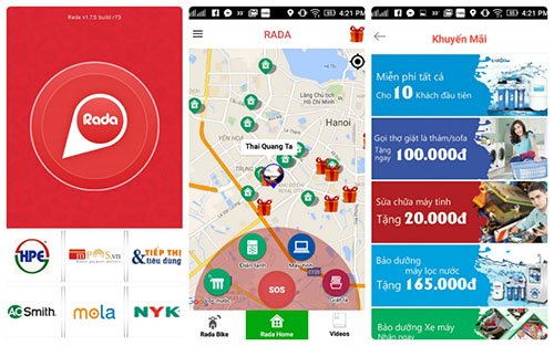 Rada là ứng dụng di động cung cấp dịch vụ cứu hộ chuyên nghiệp dành cho xe máy và các thiết bị trong gia đình như điện lạnh, máy tính, giặt là, lọc nước thông qua giao diện đơn giản, dễ sử dụng. Khách hàng chỉ cần đăng nhập vào ứng dụng với số điện thoại của mình và ấn nút cứu hộ SOS là hệ thống sẽ tự động định vị địa chỉ của bạn và lựa chọn dịch vụ cứu hộ gần bạn nhất. Sau đó khách hàng sẽ nhận được cuộc gọi để xác nhận dịch vụ một cách nhanh chóng!