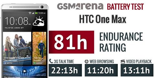 HTC One Max là chiếc điện thoại được thừa hưởng một trong những thiết kế smartphone xuất sắc nhất hiện nay từ người anh em HTC One. Về mặt phần cứng, One Max sở các thông số cấu hình ngang ngửa One với chip Snapdragon 600 và màn hình Full HD nhưng kích thước màn hình được đẩy lên tới 5,9 inch và viên pin cũng lớn hơn nhiều, 3.300 mAh. Để kiếm chứng thời lượng sử dụng của máy, các chuyên gia của trang công nghệ GsmArena đã tiến hành đánh giá và kết luận rằng One Max có thể hoạt động trung bình tới 3 ngày rưỡi, khoảng 81 giờ (1 giờ đàm thoại, 1 giờ duyệt web và 1 giờ xem video mỗi ngày) trước khi cạn pin.