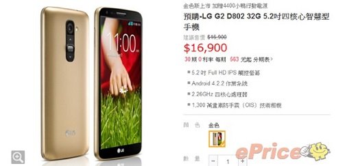 Trang ePrice vừa phát hiện một phiên bản màu vàng của LG G2 tại thị trường Đài Loan. Thiết bị có thể sẽ tung ra thị trường trong tháng tới. Mức giá của phiên bản đặc biệt này không thay đổi so với hai model đen và trắng. Người dùng sẽ phải bỏ ra 496 USD cho bản 16GB và 562 USD cho bản 32GB. Hiện tại chưa có thông tin chính xác về việc LG có đưa phiên bản này tại các thị trường khác hay không.