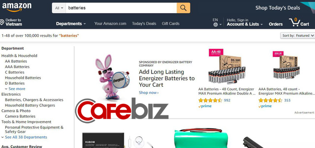 Sau khi tìm kiếm từ khóa "pin" trên thanh công cụ của Amazon, người dùng ngay lập tức thấy mẫu quảng cáo "to đùng" của Energizer với chú thỏ hồng quen thuộc.