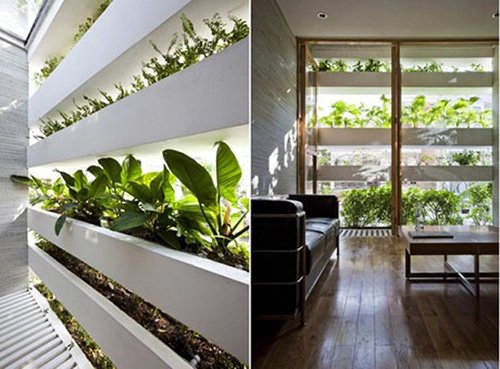 Với mong muốn thiết kế ngôi nhà mang đặc trưng của xứ sở nhiệt đới, thân thiện với môi trường, kiến trúc sư Võ Trọng Nghĩa đã thiết kế hai mặt nhà được bao phủ bởi một màu xanh đầy sức sống, chứa đựng vẻ đẹp cuốn hút.