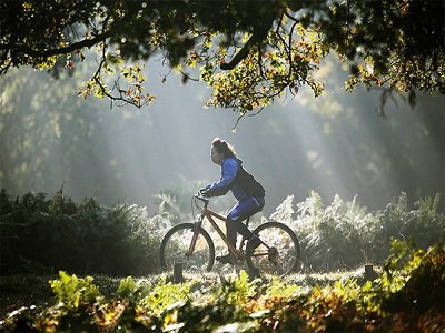 Người phụ nữ đạp xe trong ánh nắng sớm thu tại công viên Richmond