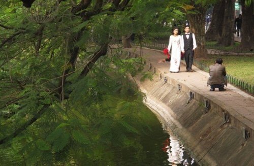 Một cặp đôi chụp ảnh cưới bên hồ Hoàn Kiếm, Hà Nội vào ngày 21/12/2012. Ảnh: Chris Brummitt/AP.
