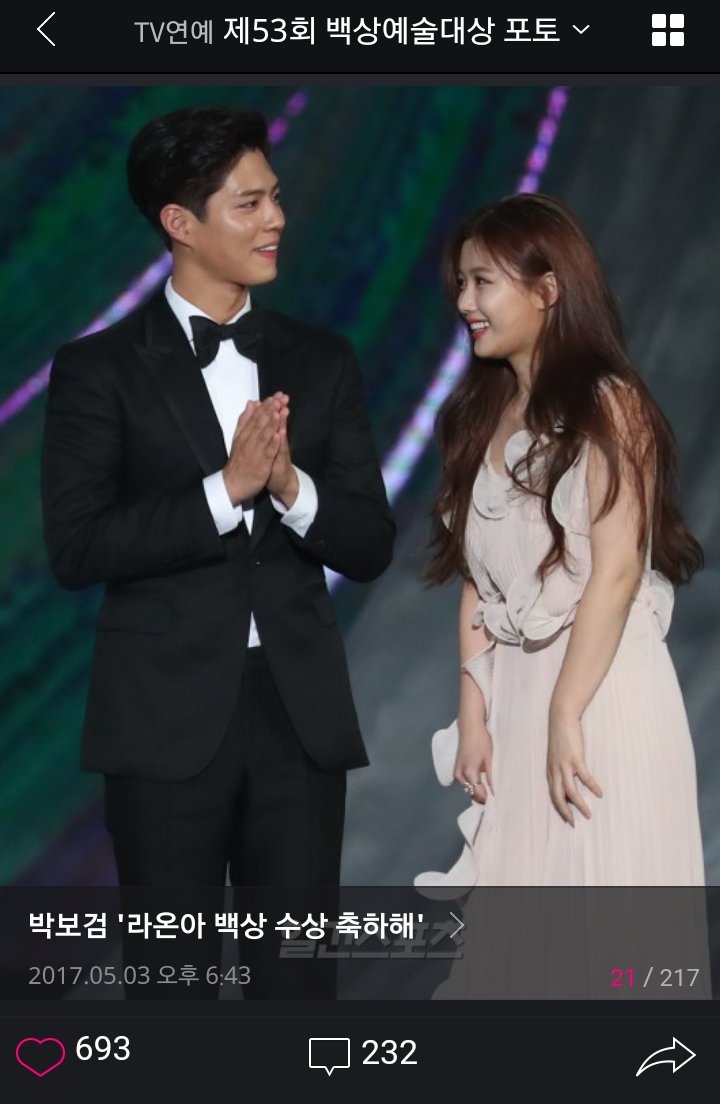 Ngày 3/5, lễ trao giải Baeksang Arts Awards 2017 được tổ chức và thu hút sự chú ý của toàn bộ truyền thông Hàn Quốc. Bên cạnh những tên tuổi gạo cội thì sự xuất hiện của cặp đôi Park Bo Gum và Kim Yoo Jung khiến những người yêu mến bộ phim "Mây Họa Ánh Trăng" vô cùng phấn khích. Dù không tay trong tay sánh bước trên thảm đỏ nhưng bù lại cả hai được nhà tổ chức sắp xếp ngồi cạnh nhau trong suốt thời gian diễn ra lễ trao giải. Chưa hết, các fan còn có dịp bắt gặp khoảnh khắc tình tứ của cặp đôi 9x.