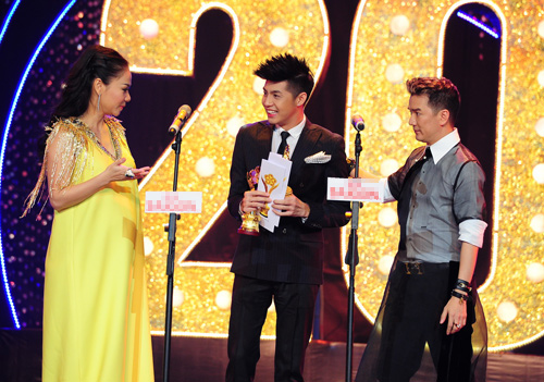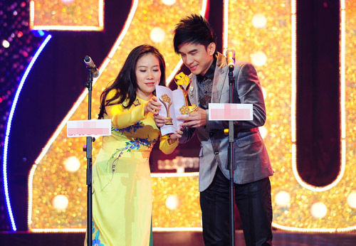 Bà bầu Thu Minh và Mr. Đàm lên sân khấu công bố kết quả Nam, nữ ca sỹ nhạc nhẹ được yêu thích nhất.