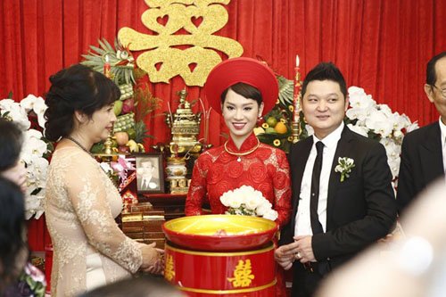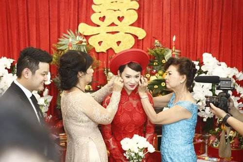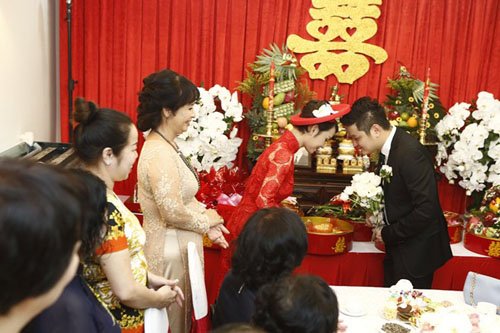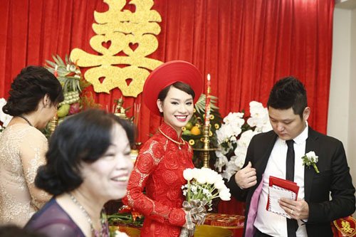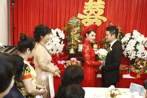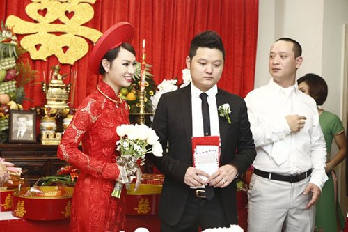 Chú rể Tô Văn Đức cầm hoa và dẫn lễ đến xin dâu. Ông xã của nữ ca sĩ từng tham gia cuộc thi Vietnam Idol 2007 là một doanh nhân có tiếng tại Sài thành. Anh sinh năm 1984 và đang sở hữu chuỗi nhà hàng